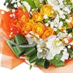 Уменьшенный: роза кустовая оранжевая - 3 шт, альстромерия белая - 4 шт, гипсофила - 2 шт, листья апсидистры загнутые - 2 шт, фетр оранжевый.